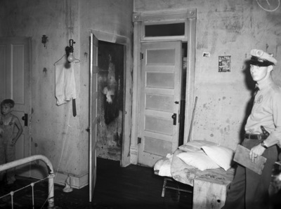 A residence on East Annie Street caught fire Saturday morning. Pictured is the view of one corner of the room where fire burned the contents of a closet. Mr. A. W. Westfall, who was ill and bedridden, was found inside the room with his night clothes afire. His twenty-one year old daughter, Lois Westfall was burned on one hand and foot when she helped extinguish her father's clothing. A fire marshal is pictured on the right, inspecting the damage. A young boy is standing in the doorway, dressed in striped overalls.