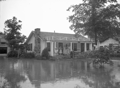 Flood Scene. Brookside Area. Water is shown standing in the yard of the home M. L. Sinder and J. F. Byas duplex residence. Standing in the yard are Mrs. Sinder and William Roundtree. On the porch are Mrs. Roundtree, Mrs. Byas and R. G. Park.