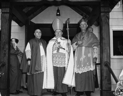 Standing outside Saint William's Church in Arlington, Texas are, left to right, Monsignor Joseph G. O'Donohoe, Bishop William D. O'Brien and Bishop Joseph P. Lynch. They are wearing ceremonial robes. Bishop O'Brien is holding a staff. Taken during the dedication service. Published in the Fort Worth Star-Telegram.