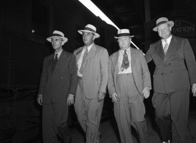 Here are R. E. Petty of Boyd, Texas; W. E. Hines of Bridgeport, Texas; W. E. Munn of Boyd, Texas; and E. G. Gasparson of Paradise, Texas. The four men are representing Wise County Water Control and Improvement District Number 1. They joined the Fort Worth Chamber of Commerce delegation train party on their way to Washington for a hearing on the Trinity River Improvement Project. Wise County floods have made it impossible for them to travel by automobile.