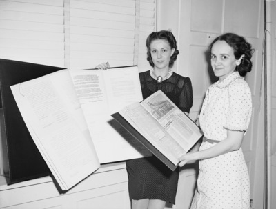 Two large volumes of supporting data which Fort Worth's delegation took along for the Trinity River improvement hearing Monday before the Rivers and Harbors Board of Review in Washington. Miss Mary Lloyd Garnett (left) holds a volume of indorsements, and Mrs. Sybil Brevard holds the book containing Trinity River publicity and newspaper accounts of current floods. The Fort Worth Chamber of Commerce, which organized the delegation, also prepared the exhibits.