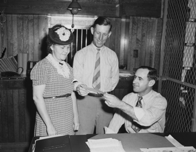 Mr. and Mrs. Walter J. Hutcheson , standing, looking at a check for $10,500 which represents their Farm Security Administration (FSA) loan for the purchase of a farm south of Arlington. Seated at his desk is Elliot C. Jameson, rural supervisor for FSA, tending the sum a few minutes before the purchase was made. The men are wearing pants, shirt and tie; while Mrs. Hutcheson is wearing a printed dress with lace collar and a small netted hat. Published in the Fort Worth Star-Telegram morning edition, June 17, 1941.