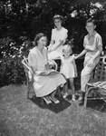 Mrs. Edward L. Baker and children, left to right, Kathryn Ann, 13, Louella, 3 years old and Edward L. Baker Jr., 10 years old. The family is outdoors around a patio set enjoying the sunshine. Mrs. Baker is seated on a chair with a book in her lap. Kathryn Ann is sitting on the table, Louella, in a romper, is standing next to her mom, and Edward is resting on the arm of a chair, next to Louella.