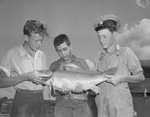 Joe Wetzel, J. C. Heflin and T. V. Milam looking at a fish during the flood at Brookside area.