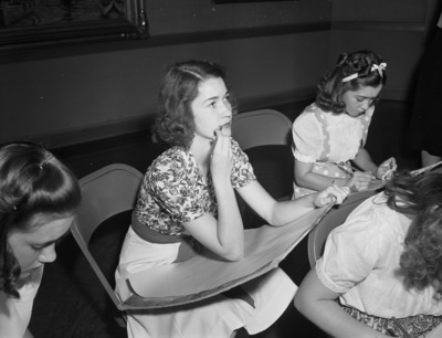 Genevieve Russell, 2818 Lowden Street, Fort Worth, Texas and a student at Paschal High School, attends a Fort Worth Art Association summer class. The classes are held in the Fort Worth Public Library. Ms. Russell sits in a metal folding chair with a large sketchpad in her lap and a drawing pencil in her hand. This photograph was published in the July 6, 1941 morning edition of the Star-Telegram.