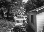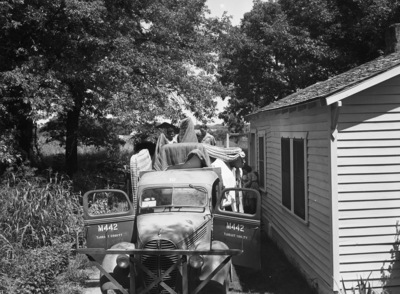 County truck moving out F. A. Carson family during a flood at Brookside area in Fort Worth, Texas. In the rear of the truck are, left to right, F. A. Carson and Buddy Scott.