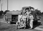 United States Army. New type oil truck and drivers. Left to right, kneeling, Alford S. Agocs, New York City, and Philip C. Pecorella, Long Island, New York; standing, J. Leon Barrow, his mother, Mrs. Jesse L. Barrow; John Olayn Booton, New Jersey (on front fender), Robert Launt, Johnson City, New York and Robert B. Minto, Rutherford, New Jersey (in cab).