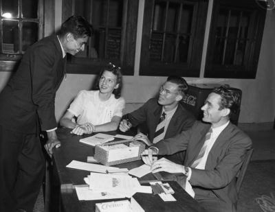 Cumberland Presbyterian Church. Grand Assembly. Joe King, left, of Haworth, Okhlahoma, a Choctaw Indian, registering. With him, left to right, are Ann Whiteside, Denton; Thurman Levacy, Longview, and Dobbins, Denton.