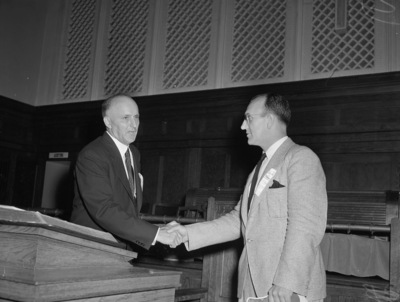 Cumberland Presbyterian Church. Grand Assembly. Reverend Keith T. Postlethwaite of Birmingham, Alabama, left, retiring moderator, greeting the new moderator, Reverend L. L. Thomas of McKennie, Tennessee.