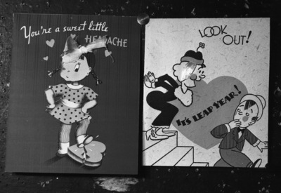 In addition to the Victorian Valentines that are regaining popularity, are the standard Valentines with puns and wisecracks. Pictured are copies of two standard Valentines. The one on the left features a girl stepping on a heart with the caption, "You're a sweet little headache". The card on the right shows a woman crouching at the top of a staircase and a man walking down. The caption reads, "Look Out! It's Leap Year!" Published in the Fort Worth Star-Telegram evening edition, February 7, 1940.