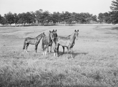 Shot of four horses in a field on Pine Acres Farm, owned by O. M. Boren. In the background are several trees and a fence.