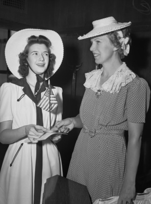 Miss Mary Charlotte Faris, left, presenting an American flag to Mrs. Theodora Yordanoff, who recently obtained her United States citizenship at the United States District Court in Fort Worth, Texas. Miss Faris is a member of the Captain William Scott Society of the Children of the American Revolution. Miss Faris is wearing a hat, pearl necklace, and a dress. Mrs. Yordanoff is wearing a hat and a floral print dress with a lace collar.