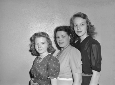 Jane Passmore, Eva Pearl Sheffield and Anne Huffines are three former Lena Pope Home girls who will enter nurse training at Joseph's Hospital School of Nursing. They have been classmates at the Home for 10 years. They are standing against a wall, ordered by height from shortest to tallest. Miss Passmore is wearing a polka-dot dress and pearl necklace. Miss Sheffield is wearing a dress with a belt at the waist and a necklace. Miss Huffines is wearing a dark colored dress with a belt at the waist.