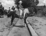 Dickens County is celebrating the 50th Anniversary of the county's organization at the the Spur Roundup and Rodeo. Participating in the Spur, Texas, parade is Peggy Beth Koonsman. At five years old, she is the youngest rider in the parade. She is the daughter of Mr. and Mrs. Jim Koonsman, of Dickens County. Peggy Beth is shown riding her pony. She is dressed in a cowboy hat, western blouse, trousers, and cowboy boots.