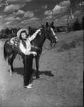 Dickens County is celebrating the 50th Anniversary of the county's organization at the the Spur Roundup and Rodeo. In attendance is Jo Ann Stephens. She was named "Miss Abilene" at the Rodeo. Miss Stephens is pictured standing next to her horse. She is wearing a cowboy hat, western blouse, bandanna, trousers, and cowboy boots.