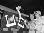 United States (U. S.) Army entertainment. Left to right, Tommy Trent, maestro of the Rough House Marionettes; and Corps. Samuel Robertson Chicago, and Jimmie Lovell, Houston, Texas.