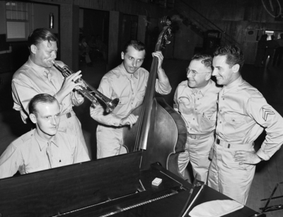 Portion of Camp Wolters orchestra: Left to right, George Thompson, Cincinnati, Ohio at the piano; Hal Weintraub of New York, New York; Sam Ruggerio, New York, New York; Master Sergeant. H. M. Busley, director, and Corpsman Johnny Mensinger, Cincinnati, Ohio.