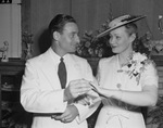 Clyde "Rabbit" McDowell and his bride, the former Mrs. Hazel Palmer. Mr. McDowell is slipping a wedding ring on his wife's finger during their marriage ceremony. Mr. McDowell is wearing a light-colored suit with a dark tie and his wife is wearing a wide-brimmed hat, a short-sleeved dress and floral accessories on her shoulder. Behind them, a bouquet of flowers can be seen on a wooden table. Mr. McDowell plays for the Fort Worth Cats baseball team.