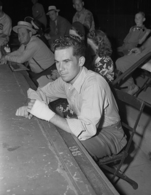 Bill Skelley, Fort Worth Cats shortstop, watching the game from a box seat. On the edge of the table the number "36" can be seen. Skelley is wearing a striped, long-sleeve shirt with a pair of trousers. His left hand is bandaged because of an injury on his palm. Behind him, other men and women are seen seated and looking on at the game as well.