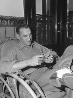 Freddy Martin, Houston Buffaloes pitcher. Martin is reclining on a cushioned, wooden chair as he reads a letter from his hometown of Cameroon, Oklahoma. He is wearing a long-sleeved, collared shirt with thinly striped trousers. His left foot is up and resting on his right knee. He is holding a cigarette in his left hand. Behind him is a tiled wall and a dark doorway that leads into a different room. He is an undefeated pitcher and will try for his 14th win later in the week.