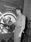 Freddy Martin, Houston Buffaloes pitcher. Martin is standing next to a movie poster that he encountered on the sidewalk. The poster shows a young woman pointing while the young soldier next to her points his gun in the same direction. The text above the duo reads, "The army gives up hope!" Martin is smiling as he does a thumbs up with his right hand and holds a cigarette in his other hand.