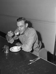 Freddy Martin, Houston Buffaloes pitcher. Martin is sitting at a table, eating breakfast from a small bowl. He is taking a bite from his spoon. On the table there is a small beverage and some utensils close by. He is wearing a long-sleeve, button-up shirt and behind him is a wall.