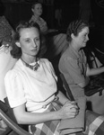Mrs. Claud Horton, wife of a Fort Worth Cats baseball player. Mrs. Horton is sitting in a wooden chair next to a few other women close by. She is wearing a dress that has a checker-patterned skirt and a beaded necklace. She is holding her clutch purse on her lap. The unnamed woman sitting next to her, at right, is smiling slightly and also has a purse in her lap.