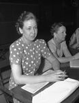 Mrs. Bob Linton, wife of a Fort Worth Cats baseball player. Mrs. Linton is sitting at a table, wearing a polka-dotted, short-sleeve dress. On the table in front of her is her small, clutch purse and a scorecard. She is also holding a pencil in one of her hands. A couple of other unnamed women are sitting at the table as well, with scorecards.