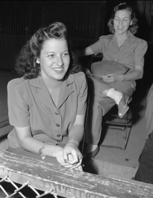 Mrs. Roy Easterwood, wife of a Fort Worth Cats baseball player. Mrs. Easterwood is sitting in a chair with her hands resting on one of her knees. She is wearing a short-sleeved, button-up blouse and a matching skirt. Behind her is an unnamed woman sitting in a different chair. Both women are smiling.