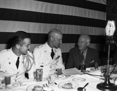 Military and civic leaders gathered to launch a drive to raise $60,000 in Tarrant County for the United Service Organizations (U. S. O.). Brigadier General W. H. Simpson, commander of Camp Wolters, center, chats with John E. Farrell, general chairman, right, and Lieutenant George S. West, his aid, left, at the luncheon table at the Fort Worth Club. General Simpson and Lieutenant West are wearing their military uniforms. Mr. Farrell is wearing a suit. On the table are several plates, glasses and silverware, and a stack of documents bound with a paperclip.