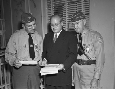 Veterans of Foreign Wars. Texas Department Purchase of defense bonds. Left to right, Walter J. Gates, of Galveston, Texas, Mayo Bowen, executive vice president of the First National Vank, and Tom H. Carter of Lubbock, Texas, VFW state commander.