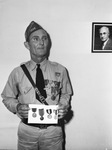 George C. Jackson of Pasadena, Texas, first American combat soldier to set foot France during World War I, showing his medals.