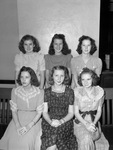 New officers of Phi Chi Psi sorority are: seated, left to right, Edith Davies, Elaine Shifflett and Molly Jo Childress; standing, left to right, Nina Elliot, Virginia Elliott and Jane Burns. Miss Davies is the corresponding secretary. She is wearing a dress with lace around the collar and sleeves. Miss Shifflett is the re-elected president. She is wearing a floral print dress. Miss Childress is the vice president. She is wearing a plaid print dress with a wide collar. Miss Nina Elliot is the pledge mistress. She is wearing a striped dress. Miss Virginia Elliot the recording secretary. She is wearing a solid colored dress. Miss Burns is the treasurer. She is wearing a striped, button-down dress. The sorority honored its rushees at a tea at the home of Miss Drusilla Cochran.