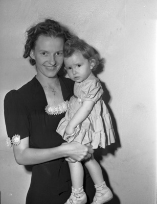 Mrs. George Kelly and her 16-month-old daughter, Georgia Sue. They will be visiting Mrs. Kelly's mother, Mrs. Nannie Stephens, and Mrs. Kelly's aunts, Miss Verna D. and Miss Mary Stephens, in Los Angeles, California. Mrs. Kelly is wearing a dark colored dress with lace floral details along the neckline and edge of the sleeves and a cross necklace. She is carrying her daughter, who is wearing a gingham pattern dress.