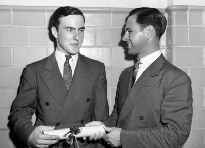 Amon Carter, Jr. (right), hands George Hosey, Jr. (left) a scholarship to Texas University.