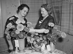 The Oak Lawn Garden Club held their annual Midsummer flower show. Mrs. H. W. Smith, left, and Mrs. Robert F. Stark, are shown with the prize winning entries. Mrs. Smith is chairman of the show. She is wearing a polka dot dress with lace around the collar. Mrs. Stark is president of the club. She is wearing a dark colored dress with a flower pinned to the front. Winners of the blue ribbons were Mrs. R. E. Barr's large vase arrangement and Mrs. Ira C. Harris' basket arrangement.