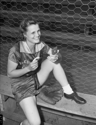 Bertie Mooty, shortstop on the Sleep Ezy Mattress girls' softball team, applying makeup. Bertie is sitting on a long wooden bench with one foot resting on top of it. She is smiling as she holds her small powder container in one hand and the power puff in the other. She is wearing her softball uniform that reads "Sleep-Ezy," on the front, and has her softball glove set between her legs. Behind her is a wire fence. She is the younger sister of Jake Mooty, a Chicago Cub pitcher.