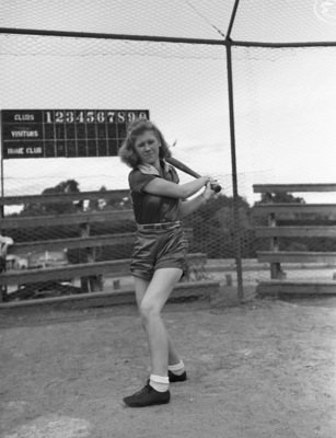 Shirley McCullough, outfielder for the Sleep-Ezy Mattress girls' softball team, at bat. Shirley is shown taking a step forward with the bat behind her back, ready to swing. She is wearing her softball uniform that includes a pair of shorts and a belt around her waist. Behind her is a wire fence and two sets of bleachers. Above the bleachers is a large score board.