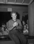 Louis Collins, Lone Star Gas softball pitcher. Mr. Collins is sitting on the edge of a large window, looking down and smiling at the softball in his hands. He is wearing his team uniform. Crowded behind the window are several children who are looking at Mr. Collins; some of them are looking at the camera.