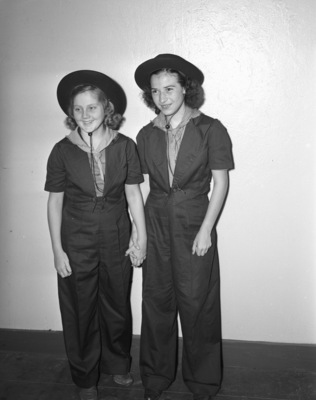 A group of fifty Texas girls are leaving on a railroad car for Kickapoo Kamp near Boulder, Colorado. Two of the girls are dressed in their camp uniforms. They are Gloria Justin and Sarah Martha Wiedeman. Gloria is the daughter of Mr. and Mrs. W. E. Justin. Sarah is the daughter of Dr. and Mrs. B. A. Wiedeman. The camp uniforms consist of a hat, blouse, vest, bandanna, and trousers. During the eight week camp, the girls will ride, hike, swim, and engage in other outdoor sports. They will also attend the Cheyenne Rodeo in July.