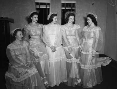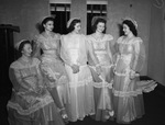 Attendants at Lovin-Edwards wedding. Left to right, Mrs. Leonard Ceo of Little Rock, Arkansas, Mrs. Robert Llewellyn, Mrs. M. Ward Bailey, Mrs. Aubrey Phillips and Mrs. Harold Banks.