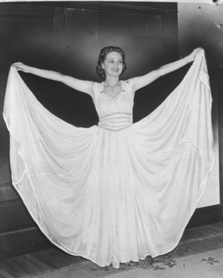 Miss Frances Taylor is proudly displaying a dress that was made from an old parachute. She is holding both sides of the skirt to show the wide, flowing design.