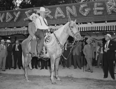 James A. Farley Junior and his father, former Postmaster General, riding a horse at Shady Oak Farm during their visit to Fort Worth, Texas. James A. Farley Senior is seated at the front, holding the reins of the horse, while his son sits behind him. They are both wearing Shady Oak hats and cowboy boots. Standing behind them is a crowd of men in front of a building.