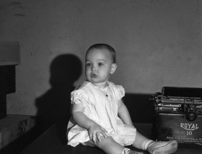 Margaret Jane Pattillo is the daughter of Mr. and Mrs. A. L. Pattillo. Margaret Jane was born on February 14, 1939 and is preparing for her first birthday. She is sitting on a desk, next to a Royal 10 typewriter. She is wearing a dress with frilly sleeves and a locket.