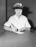 Miss Annie Mills marks her ballot for the Senate election at Central Fire Station, Precinct 4. She is wearing a blouse an hat and is standing by a counter, holding a pencil.