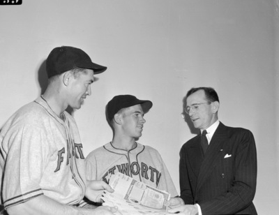 Fort Worth Cats team members buying defense bonds are Manager Bob Linton (left) and Bill Skelley. They are buying bonds from T. E. Graham (right). The Cats' players purchased 17 bonds for the team. Linton and Skelley are looking at Mr. Graham and smiling slightly, as Mr. Graham hands them the stack of bonds. Both men are wearing baseball uniforms that have "Ft. Worth" across the front of the jersey. Mr. Graham is wearing a dark, striped, double-breasted suit and a pair of eyeglasses.