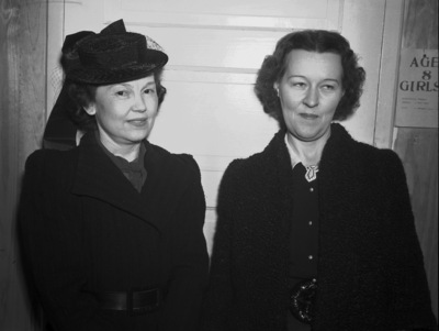 Shown here are two members of the Optimisses Club. From left to right, are Mrs. Wheeler Worley and Mrs. Lillian McKeen. The Optimisses Club is sponsoring a community clubroom for girls in Polytechnic, Fort Worth, Texas. The full name of this club is Polytechnic Girls' Community Center, under the direction of Mrs. Lillian McKeen. Girls from age six to sixteen can attended free classes or gather to play after school. Mrs. Worley is the chairman of the committee from the Optimesses Club. She is dressed in a hat, scarf, and a coat. Mrs. McKeen is the director of the club. She is also a teacher at the Community Center, offering classes in cooking, sewing, and knitting. She is wearing a button-up dress and a coat. Published in the Fort Worth Star-Telegram morning edition, February 9, 1940.
