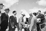 James A. Farley Senior and Junior( rearing Shady Oak Hats) Facing camera, being greeted by Amon Carter Senior and Junior.