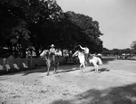 An unidentified man on horseback, possibly James A. Farley, Sr. (right), lassoes Amon Carter, Sr., who is also on horseback. This photograph was taken during Farley's visit to Shady Oak Farm.
