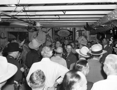Amon Carter, Sr. on horseback, in a crowd at the bar at Shady Oak Farm. This photograph was taken during James A. Farley, Sr.'s visit to Shady Oak Farm.